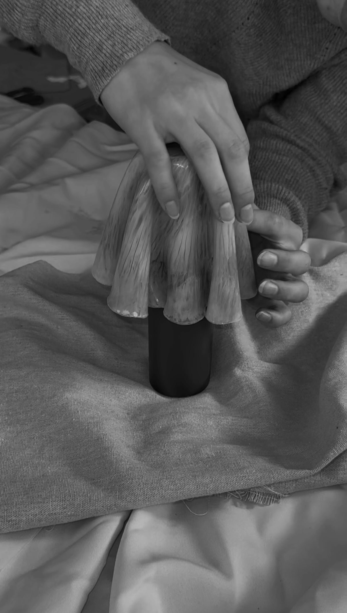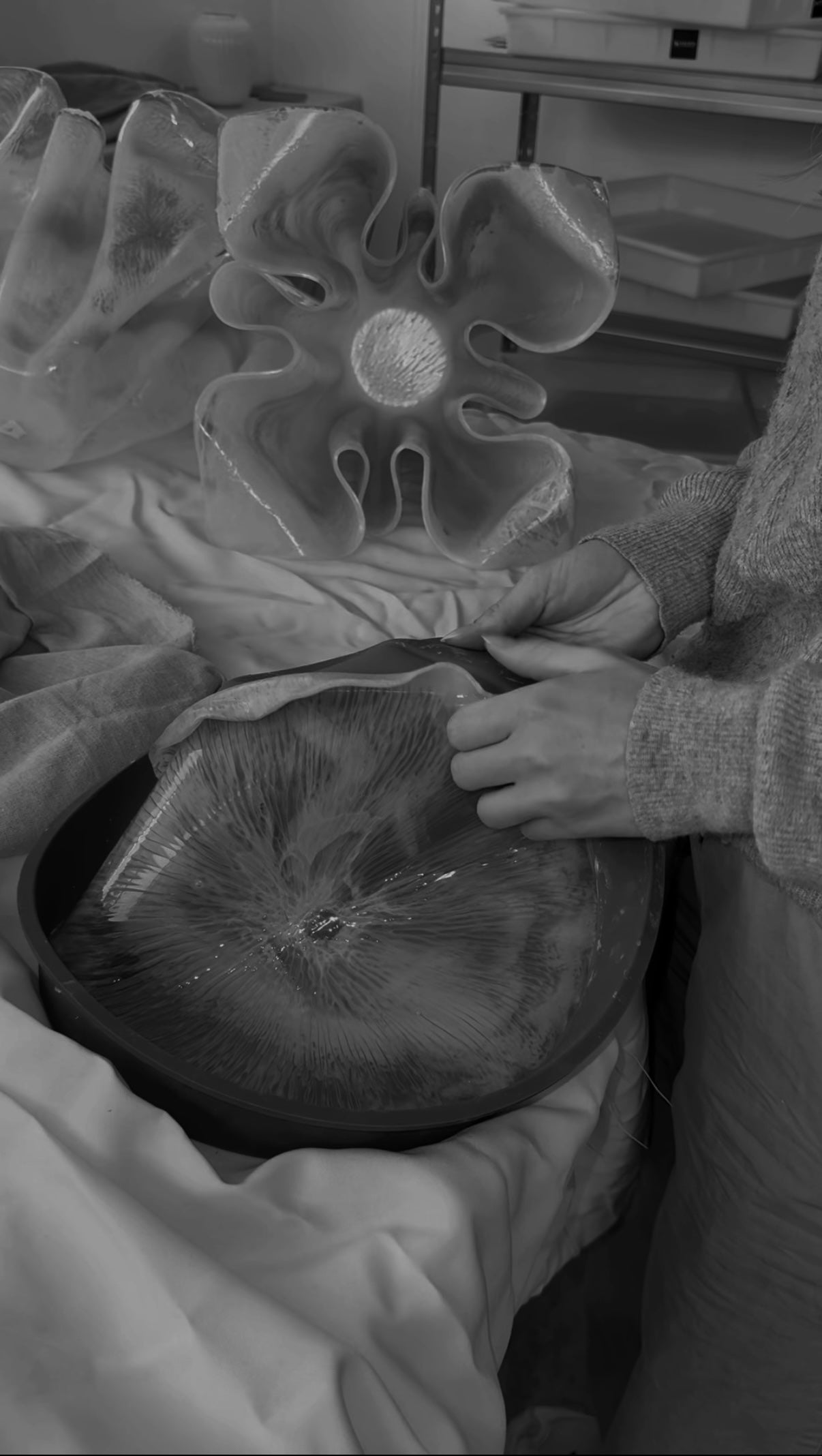 Materialet er uforudsigeligt – det har næsten et liv helt for sig selv. En del af udfordringen har været at lære tålmodighed med det, for det opfører sig ikke altid, som man forventer. Hærdetiden ændrer sig med temperatur og årstider, så det skal behandles som et levende, organisk materiale. Inden det hærder, former jeg mønstrene med omhu, så jeg kan styre, hvordan lagene udvikler sig og skabe de smukke effekter, du ser på billederne. Men det uforudsigelige er også netop det, der gør arbejdet så fascinerende og levende.