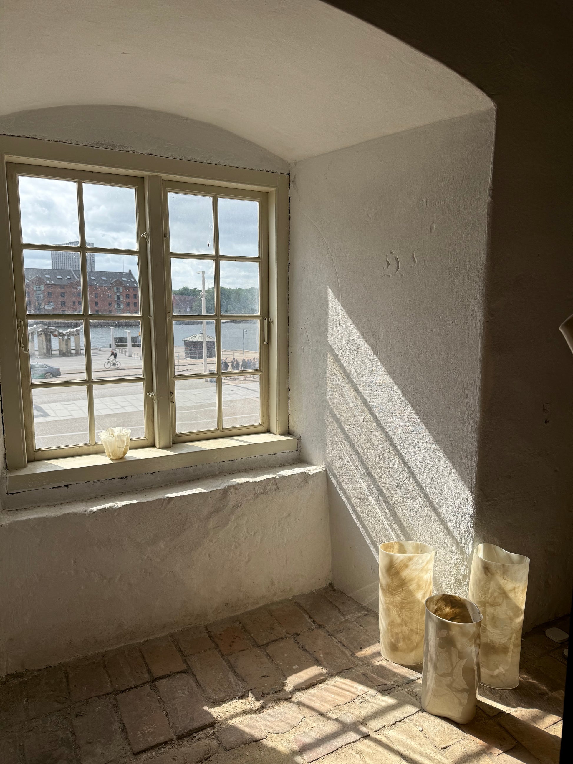 LYS & VARME: Der må kun anvendes LED-lys, da materialet hverken tåler åben ild eller varme. Når LED tændes, opstår en blød, varm glød, der forstærker værkets organiske udtryk og forandrer det afhængigt af lys og omgivelser.