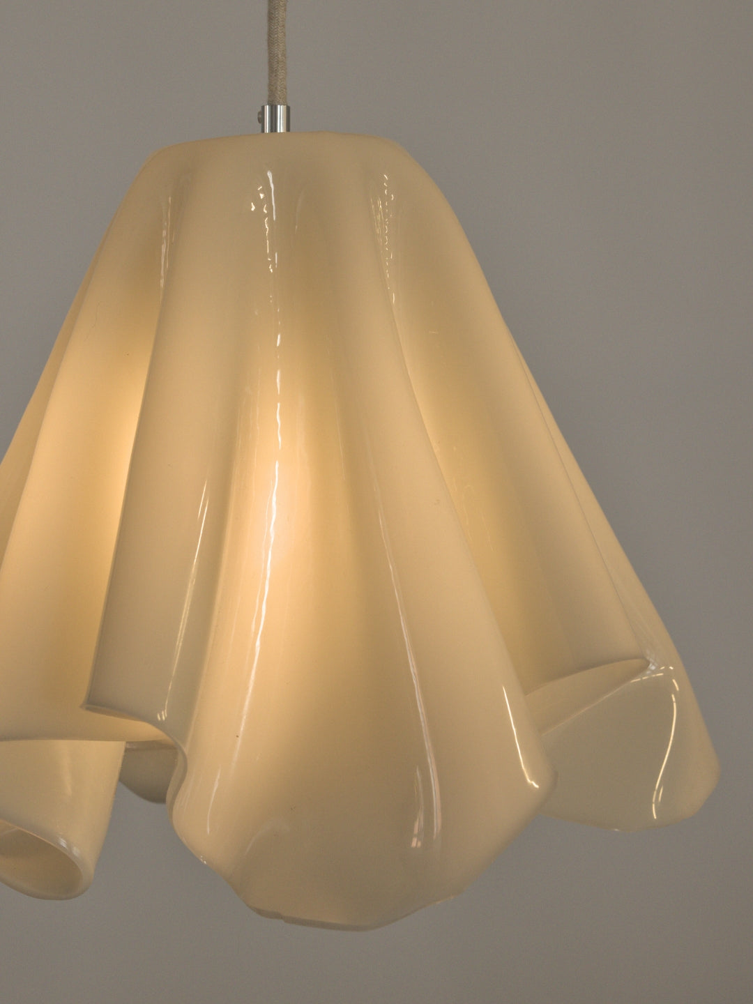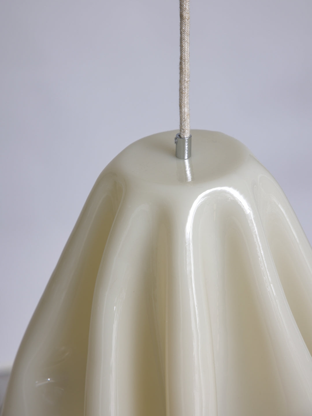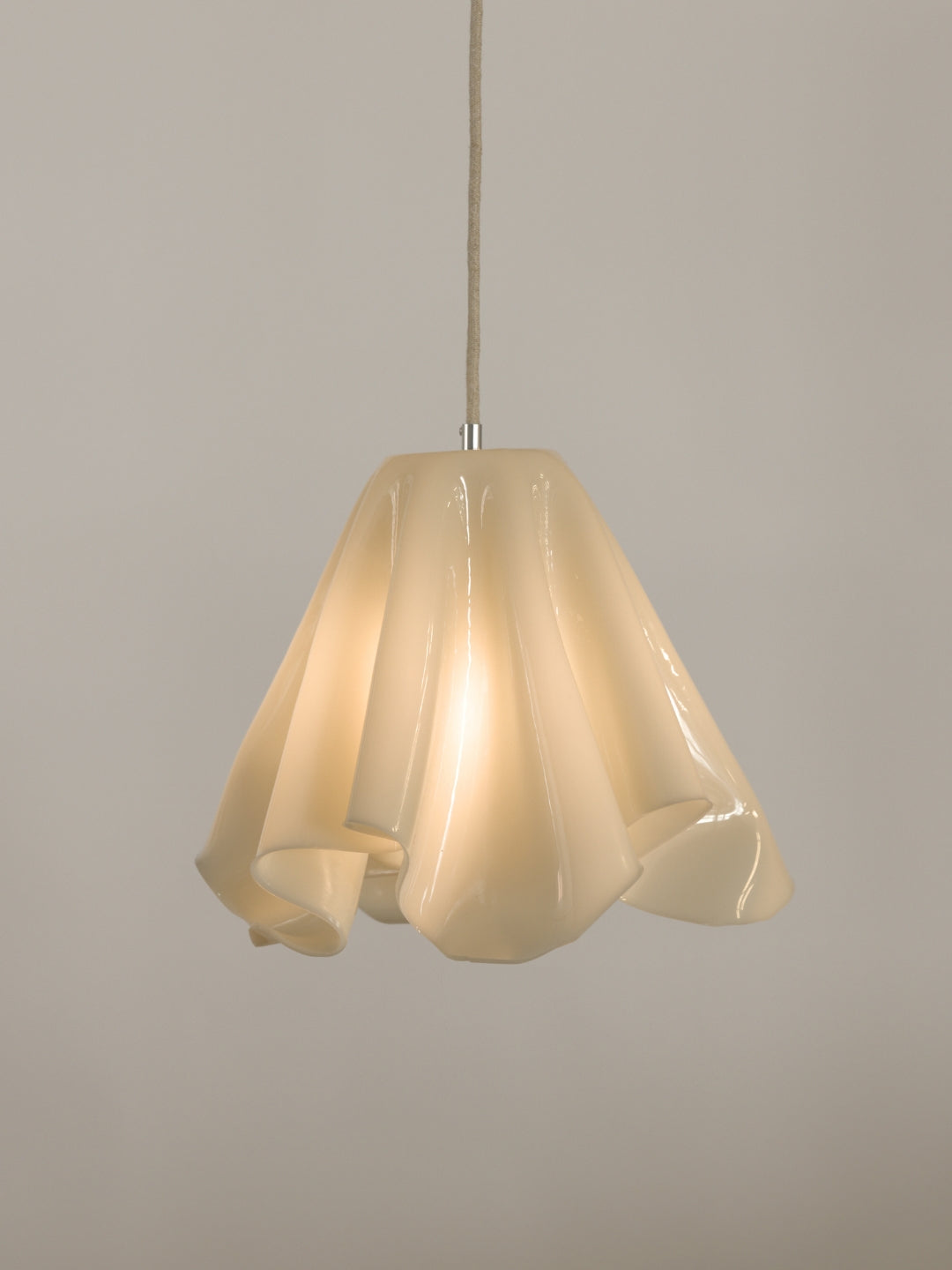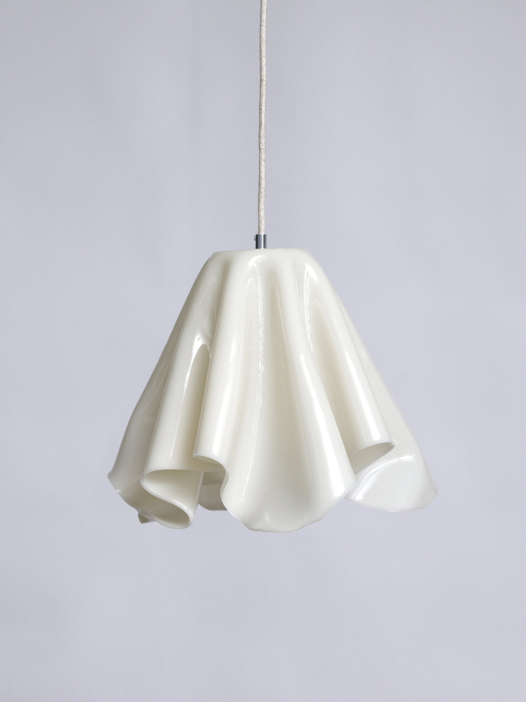 En organisk formet pendel i en blød, brækket hvid nuance – håndlavet med omtanke og uden brug af energi i selve hærdningsfasen.